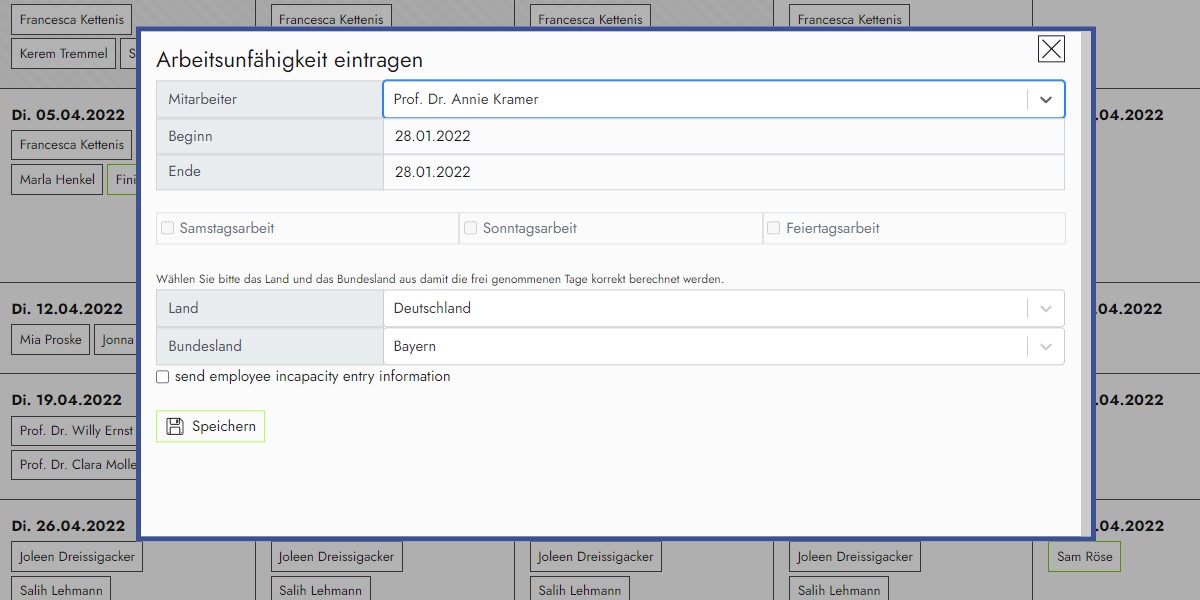 Anders als beim Planen eines Urlaubs wird das Eintragen einer Arbeitsunfähigkeit nicht mit möglichen Schichtplaneinträgen geprüft. Stattdessen wird die Arbeitsunfähigkeit eingetragen und die entsprechenden Schichtplaneinträge werden gelöscht.
