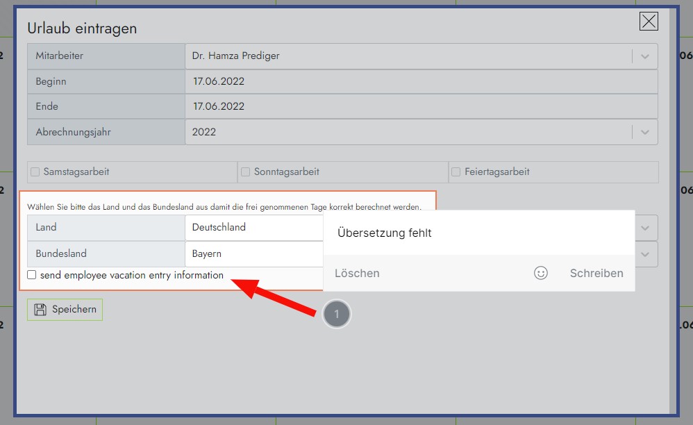 Zum Beispiel fehlt beim Eintragen eines Urlaubs eine Übersetzung um den Mitarbeitenden per E-Mail über seinen eingetragenen Urlaub zu informieren.