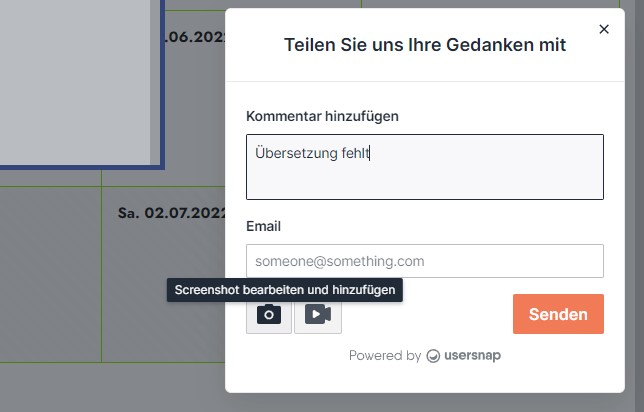 Klicken Sie auf den "Feedback"-Button, öffnet sich eine Maske, wo Sie einen Kommentar hinzufügen können. Zusätzlich haben Sie auch die Möglichkeit einen Screenshot zu machen oder ein Video zu erstellen.