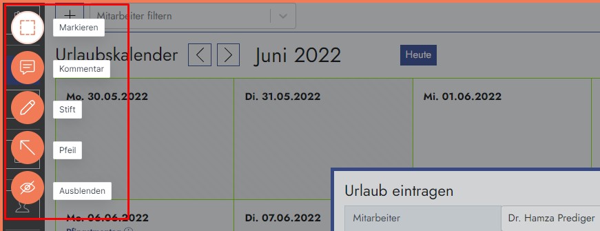 Wenn Sie einen Screenshot erstellen wollen, öffnet sich eine neue Übersicht mit möglichen Werkzeugen um auf die Auffälligkeit hinzuweisen.