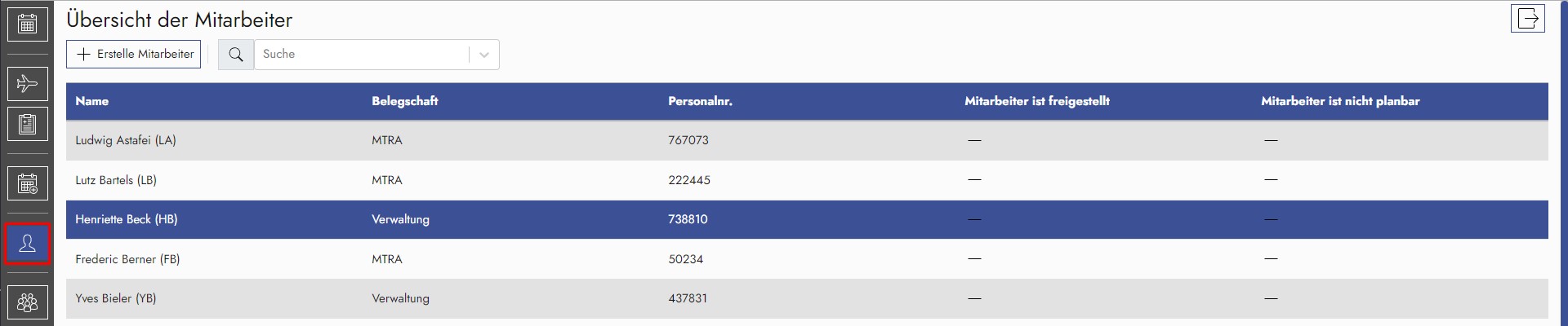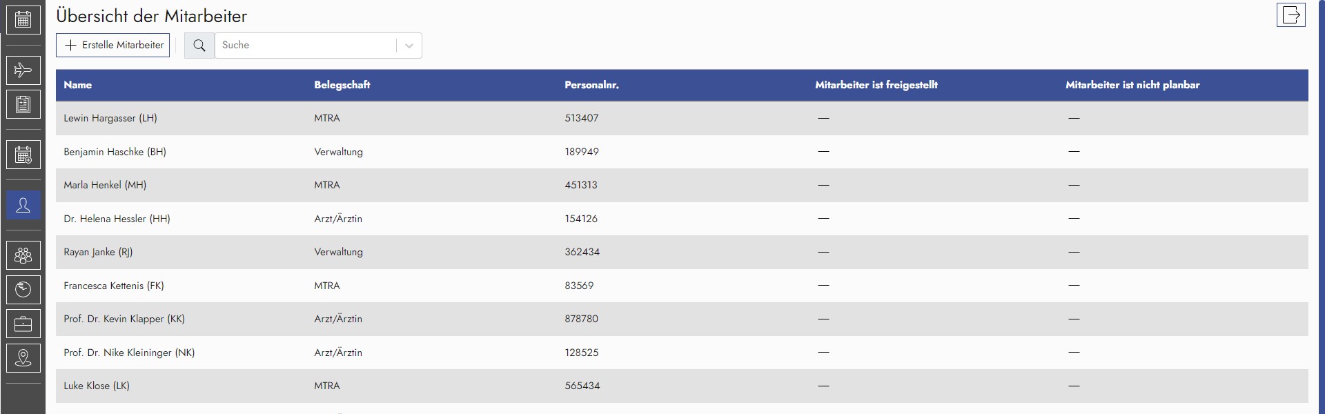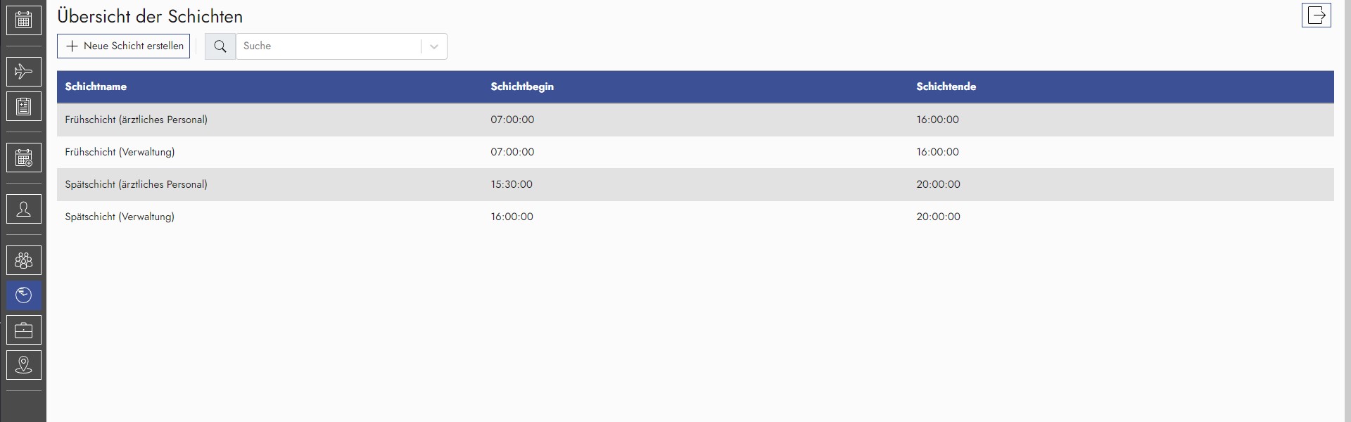Sämtliche Views und Funktionen sind nur für Administrierende und Planende einsehbar. Mitarbeitende haben aufgrund ihrer verminderten Zugriffsrechte keine Einsicht auf das Backend der Applikation. Die Mitarbeitenden verfügen über eine separierte Ansicht auf ihre Schichtplaneinträge.