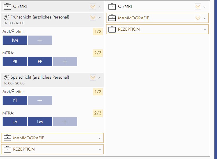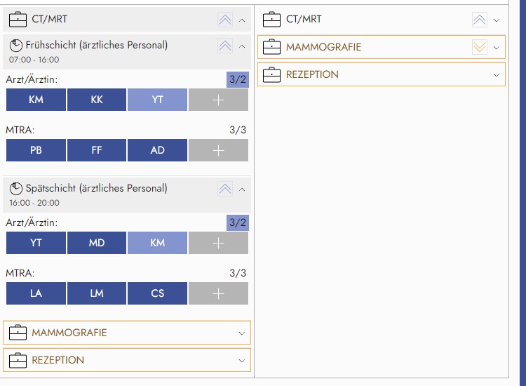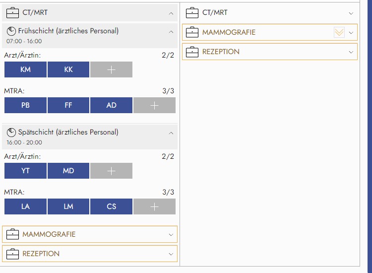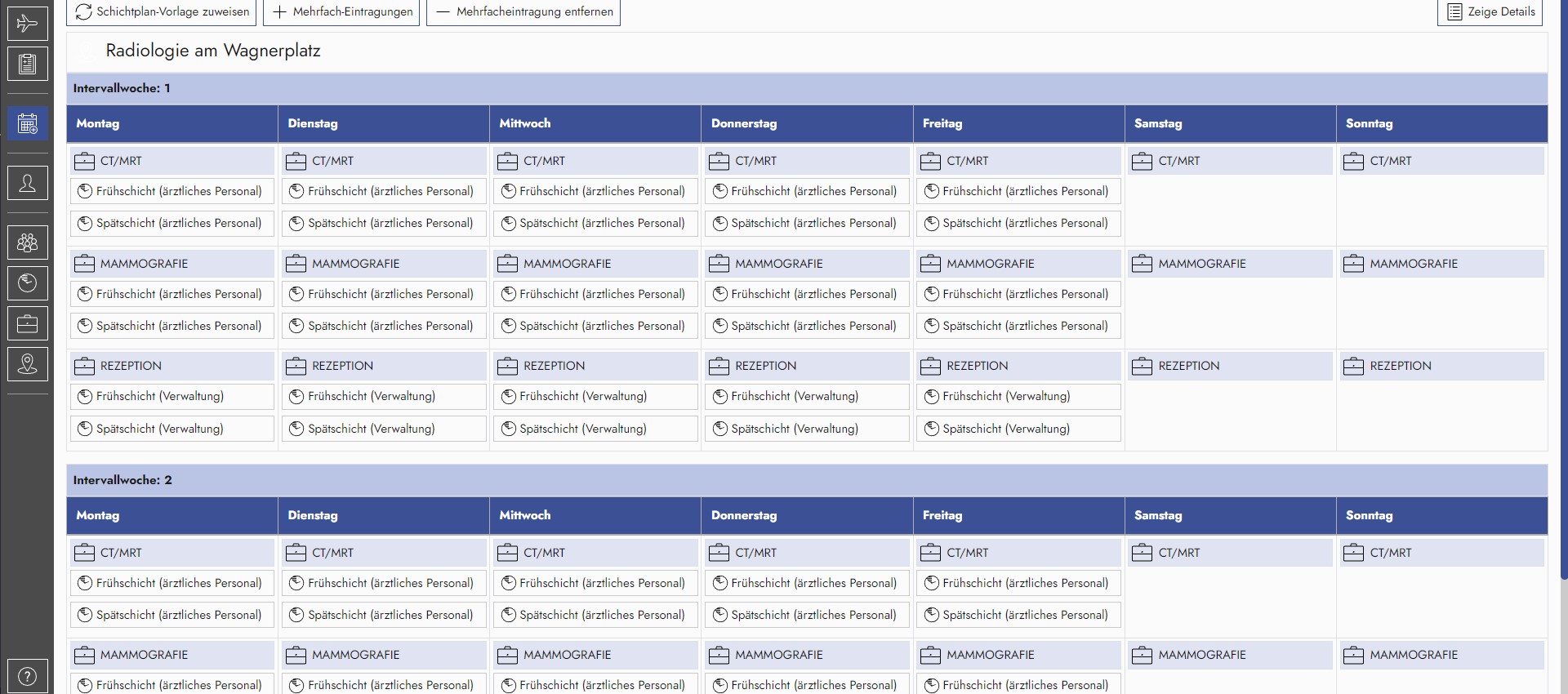Bei der Übersicht werden die hinterlegten Informationen angezeigt, die für den Standort in den Stammdaten hinterlegt wurden: Der Standort Radiologie am Wagnerplatz ist von Mo-Fr geöffnet, hat drei Arbeitsbereiche (CT/MRT, Mammografie und Rezeption) mit jeweils eine Früh- und einer Spätschicht. Da das Intervall für die Vorlage 2 Wochen beträgt, werden hier zwei Pläne untereinander angezeigt. Per Klick auf “Mehrfach-Eintragungen” gelangt man zur Planungsübersicht: