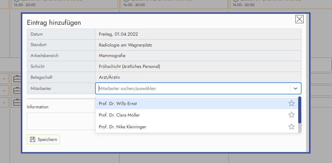 Über das “+” Symbol öffnet sich ein Menü, in dem man den Mitarbeitenden für das ausgewählte Datum einem Standort, einem Arbeitsbereich und einer Schicht einteilen kann:
