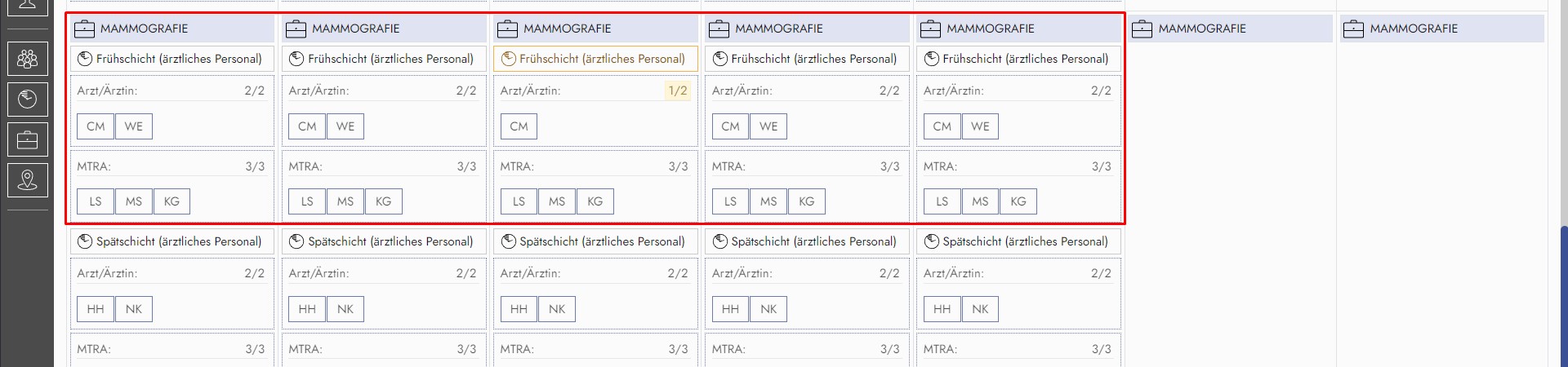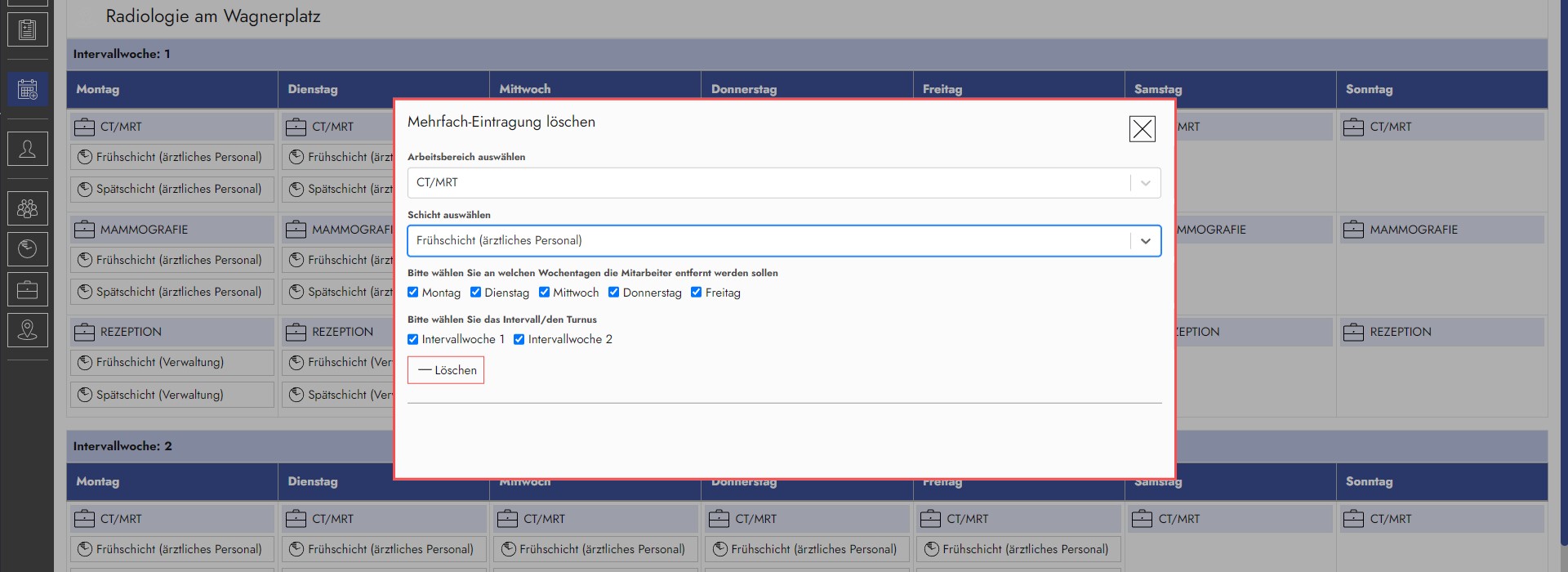 Um Herrn Prof. Dr. Willy Ernst jeden zweiten Mittwoch aus seiner Frühschicht in der Mammografie zu entfernen, klickt man in der Intervallwoche 2 auf die entsprechende Schicht und entfernt lediglich diesen Mitarbeitenden aus der Vorlage.