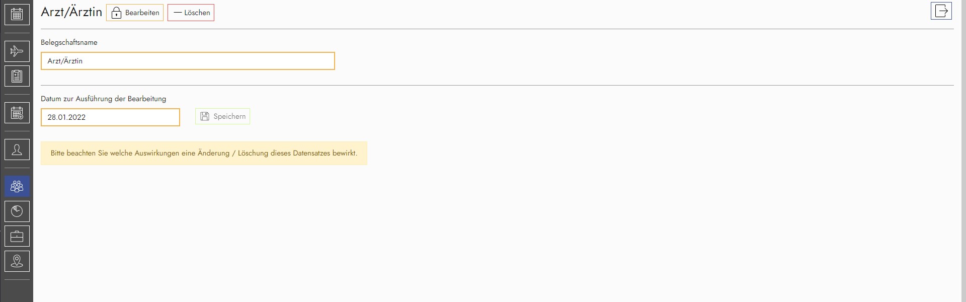 Änderungen bzw. das Löschen von Stammdaten können Auswirkungen auf den Schichtplan und die Schichtplan-Vorlagen haben. Wird beispielsweise ein Arbeitsbereich gelöscht, dann werden alle zukünftigen bereits vorgenommenen Schichtplan-Einträge dieses Arbeitsbereichs (und den dazugehörigen Schichten und an allen Standorten, an denen diese Arbeitsbereiche vorhanden waren) gelöscht. Des Weiteren können Anpassungen von Stammdaten auch Konflikte verursachen, wenn sich beispielsweise die Dauer der Schichten verändern oder wenn sich die zugewiesenen regulären oder Mindestkapazitäten der Belegschaften einer Schicht ändern.