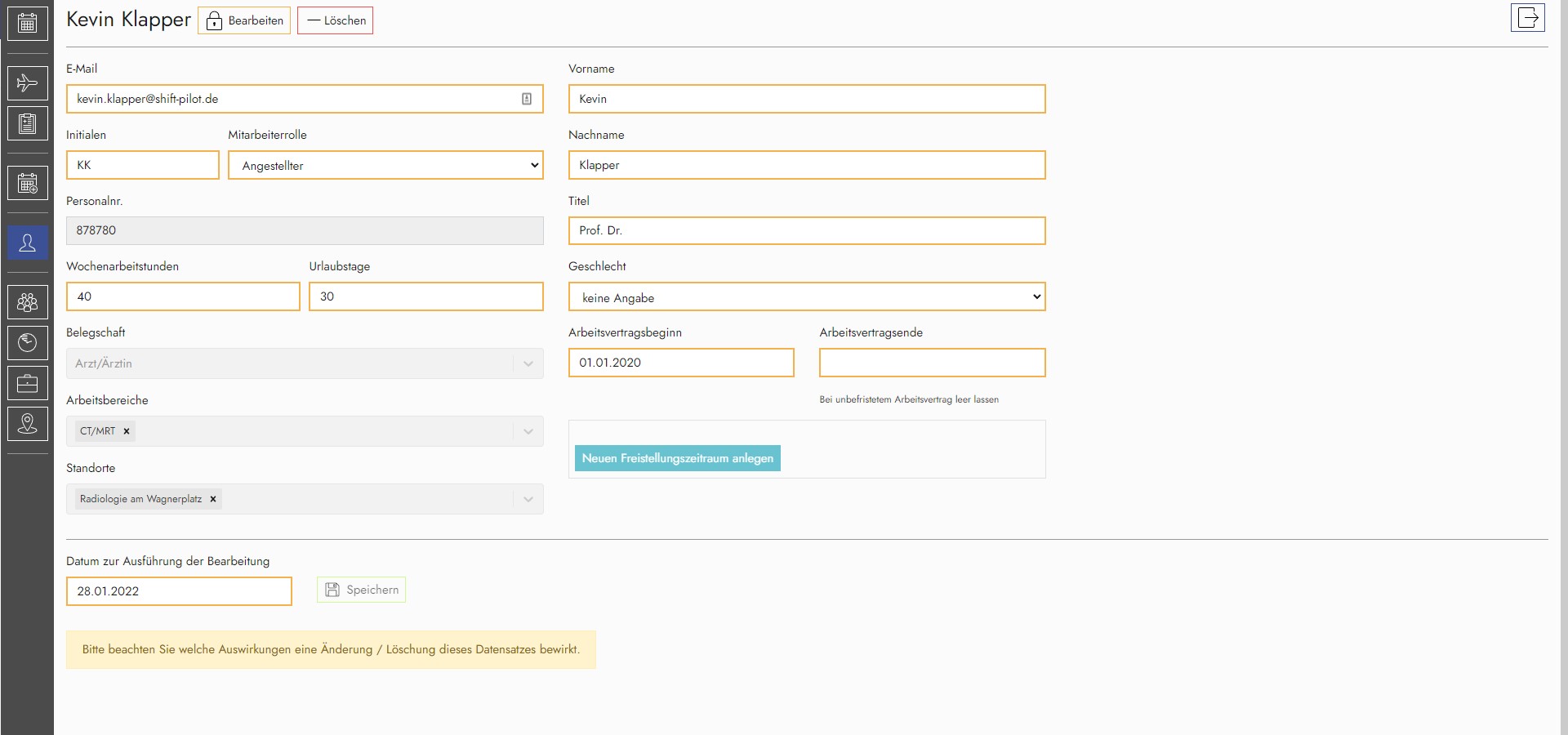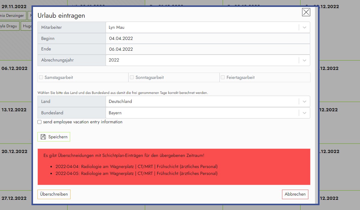 Wie bei der Eintragung von Arbeitsunfähigkeiten erfolgt auch hier keine Prüfung mit möglichen Einträgen im Schichtplan und im Urlaubskalender des Mitarbeitenden. Sowohl Schichtplaneinträge als auch Urlaubseinträge werden gelöscht.