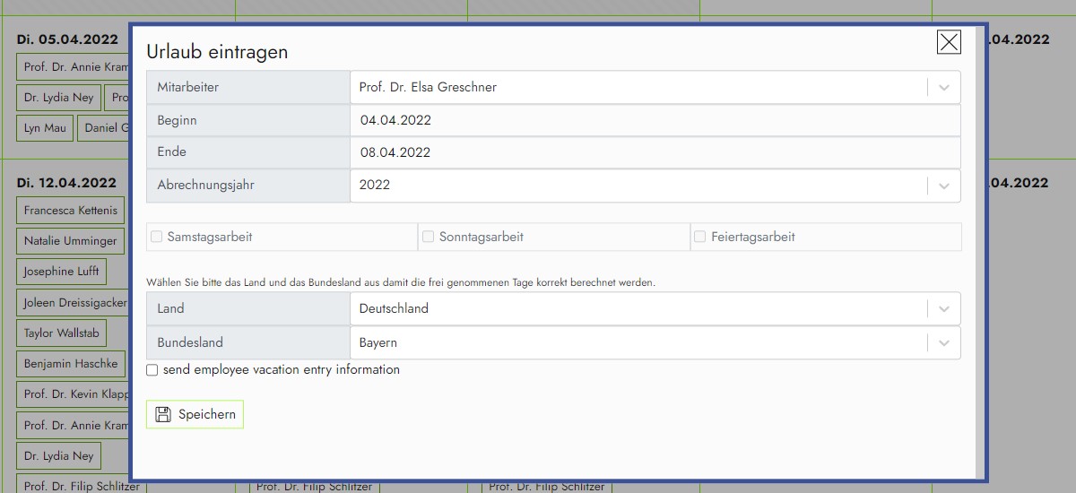 Das Abrechnungsjahr kennzeichnet das Jahr, aus welchem der Urlaub bezogen wird. Auf diese Weise können Resturlaube aus dem Jahr zuvor einberechnet werden. Das Land und das Bundesland sind für das Einbeziehen der Feiertage notwendig.